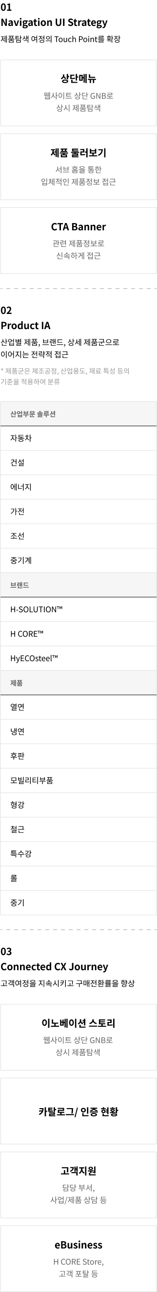 웹사이트 내에서 고객여정 전반에 걸쳐서 제품 정보와 비즈니스 고객지원을 빠르게 탐색하고 연결하며, 현대제철의 다양한 제품군을 전략적으로 강조할 수 있는